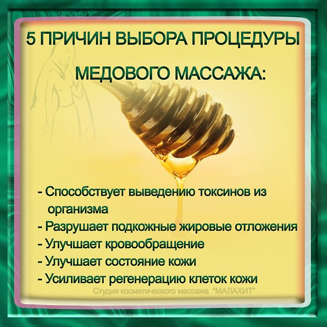 -Польза медового массажа для здоровья огромна, этой процедурой лечат: головные боли, частые простуды, бронхиты, артрозы, радикулит, остеохондроз и очень много различных заболеваний;