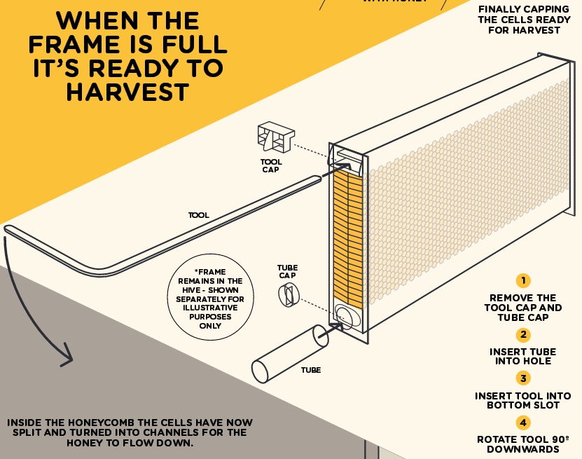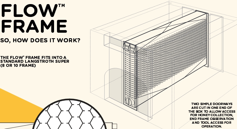 Рамка Flow Frame состоит из почти законченных сотовых ячеек. Пчёлы самостоятельно достраивают соты воском, а затем как обычно наполняют их мёдом и запечатывают. При повороте ключа, ячейки разделяются по вертикали, позволяя мёду стекать по изолированному стоку к основанию рамки и затем и за пределы улья через присоединяемую трубку. Пчёлы при этом практически не беспокоятся.