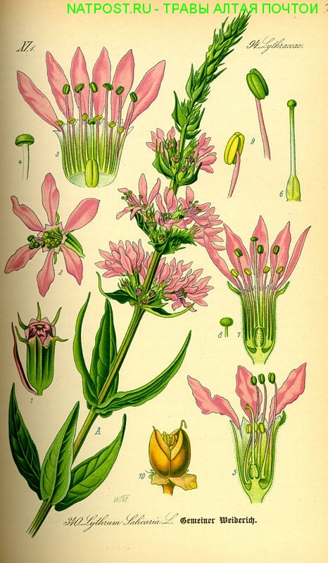 Дербенник плакун (Lythrum salicaria L) - многолетнее травянистое, густо опушенное растение из семейства дербенниковых. Стебель угловатый, ветвистый, высотой 50-90 см. Листья сидячие, сердцевидно-ланцетные, ивоподобные, нижние супротивные или мутовчатые (по три в кольце), верхние очередные. На листьях имеются большие водяные щели, через которые просачиваются капли воды из переполненных ею тканей. Цветки ярко-розовые или пурпуровые, собраны в густые крупные, колосовидные соцветия. Нектарник расположен на дне цветка, у основания пестика, в виде железистого светло-зеленого диска.