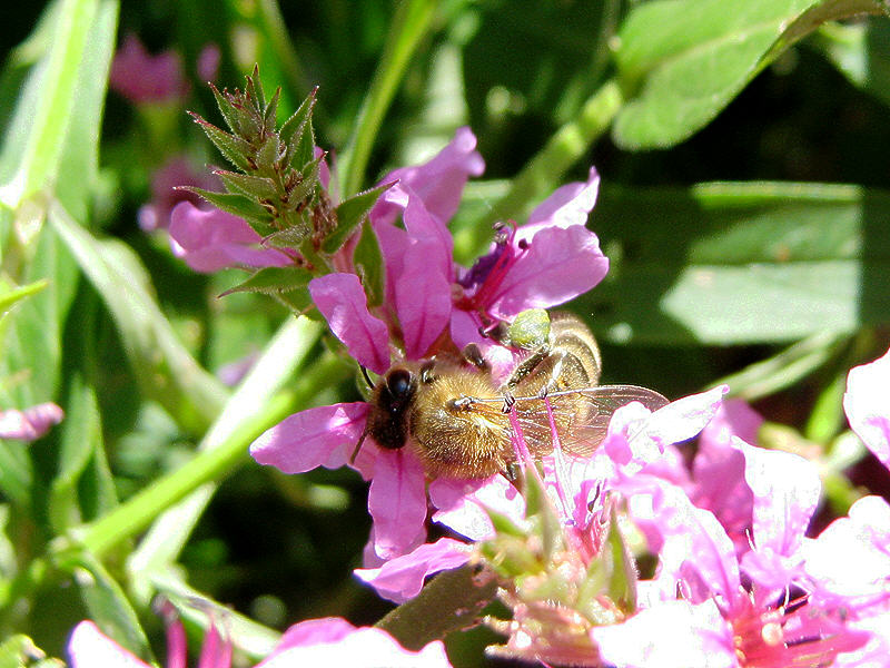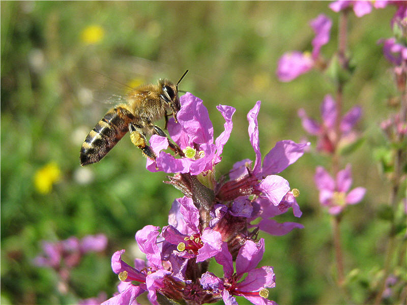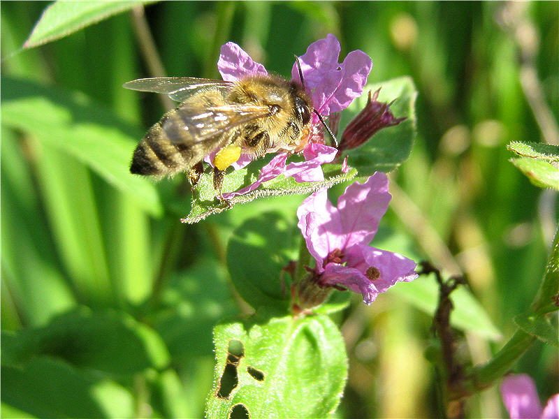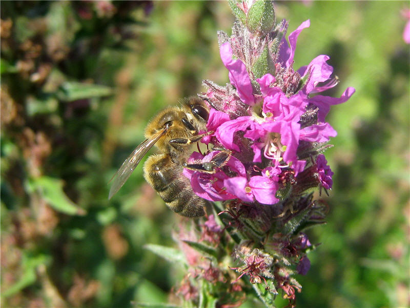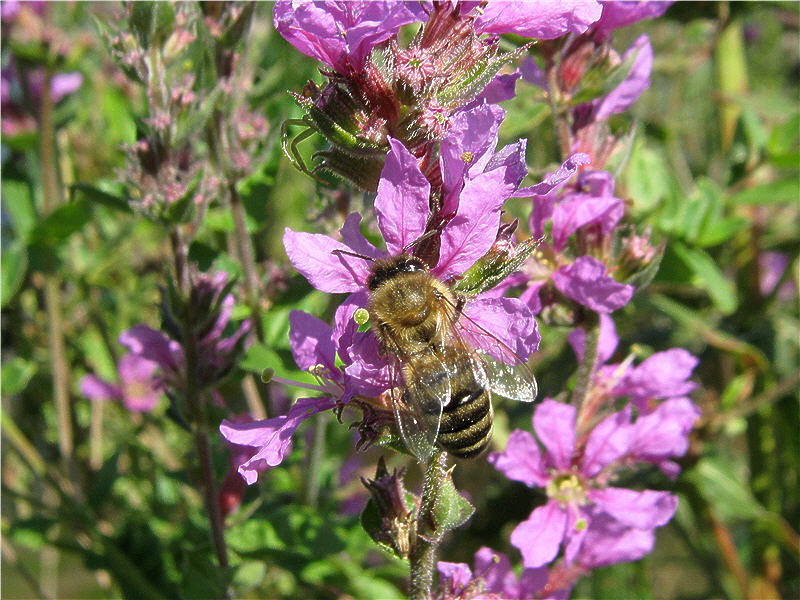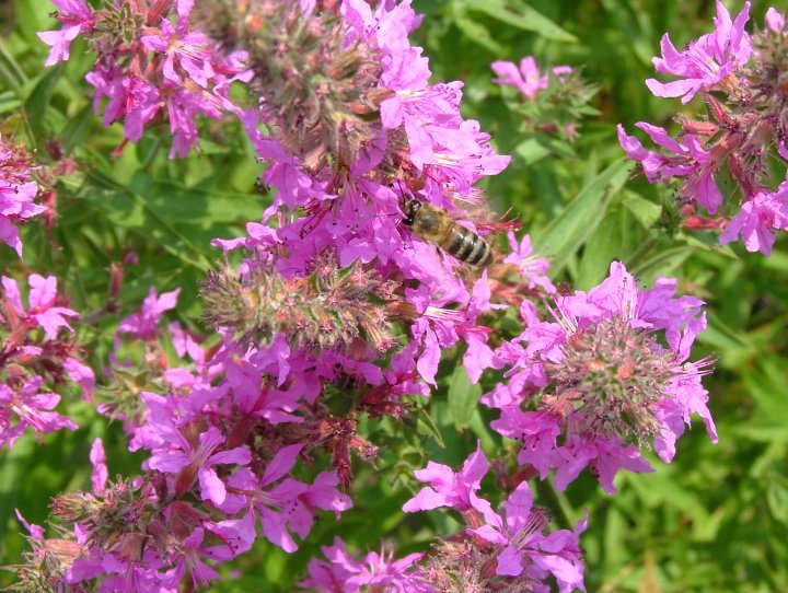 Пчеловодам, пасеки которые находятся вблизи водоемов, болот, оврагов рекомендую высевать медоносное и лекарственное растение – дербенник ивалистный. Это многолетнее травянистое растение высотой до 150 см. растет по берегам рек и озер, по сырым и заболоченным лугам, каналам. Растение неприхотливое к условиям произрастания, даволи морозостойкое. Размножить можно посевом семян и делением куста. При посеве семенами в первый год вырастают неприметные маленькие растения. Их просто можно не заметить и, подумав, что семена были невсхожими, перепахать и посеять другую культуру. Такие ошибки делал и я , но потом оставил участок без перепашки. И какое мое было удивление, когда на следующий год дербенник пошел в рост и в середине июня зацвел. Цветение продолжалось до августа месяца . Пчелы очень хорошо посещали цветки.