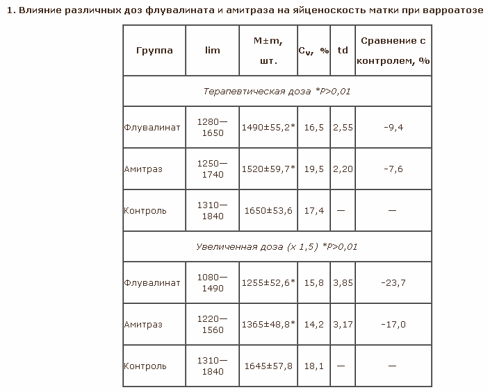 При обработке пчелиной семьи от варроатоза терапевтической дозой флувалината яйценоскость матки снизилась на 9,4% по сравнению с контролем, а при обработке ...