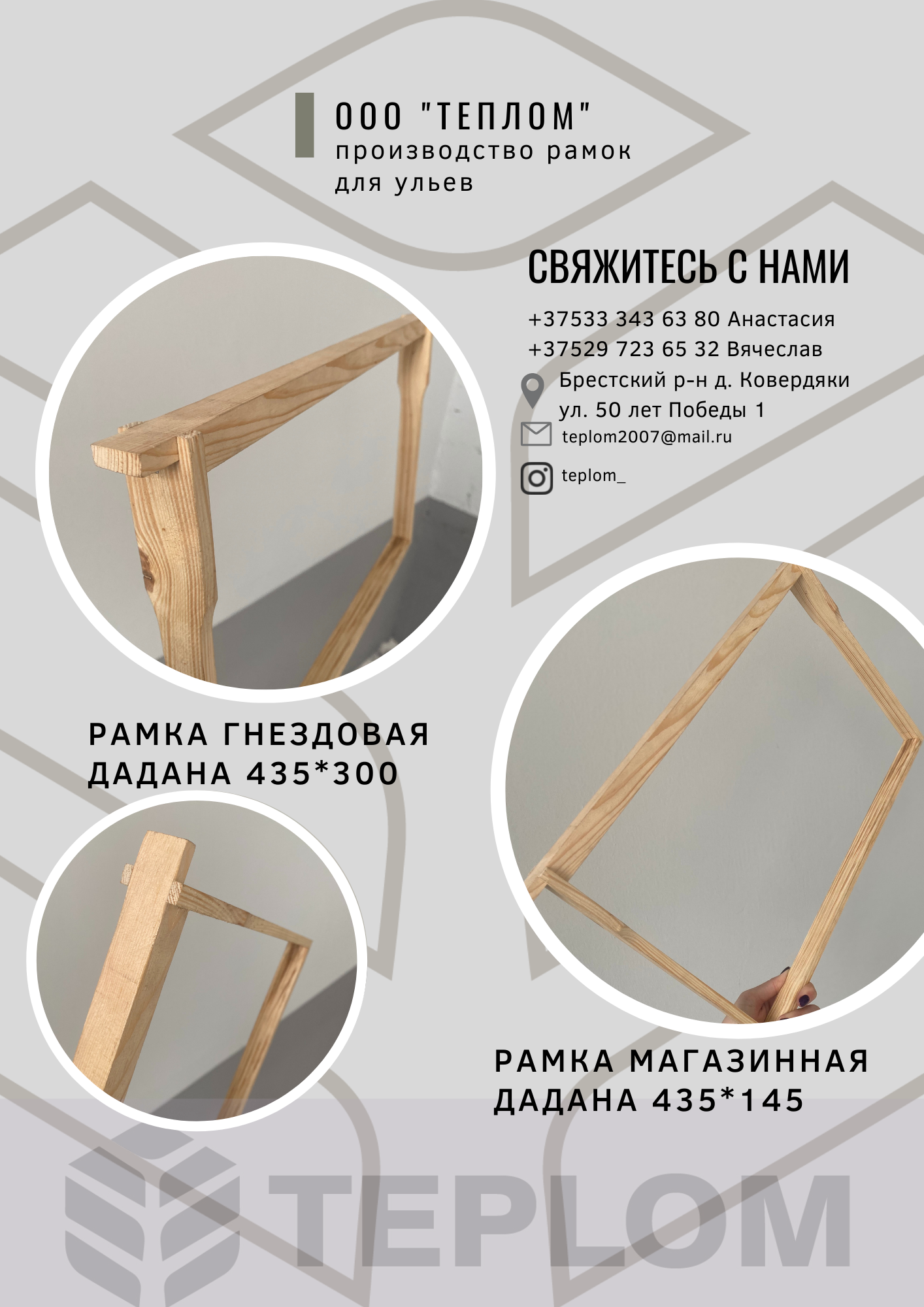 Добрый день! Меня зовут Анастасия компания ТеплоМ, мы находимся в г.Бресте.*ООО «ТеплоМ» является производителем Рамок для ульев Дадангнездовая 435*300 и магазинная ...