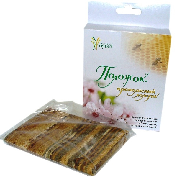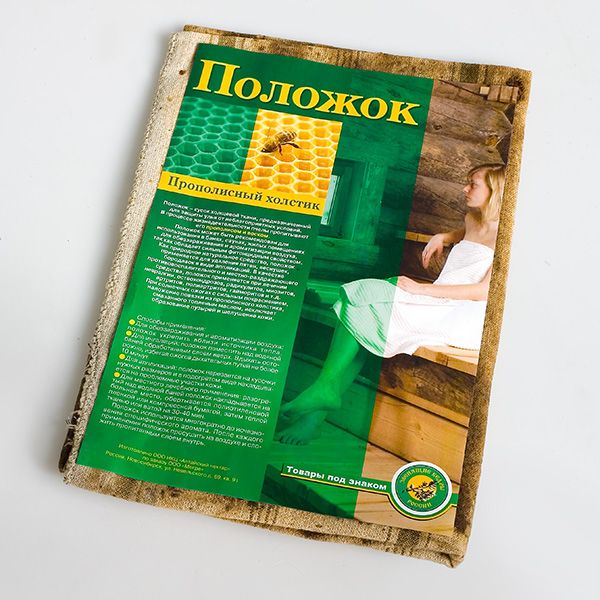 - Прополисный холстик пользуется популярностью и в ароматерапии, применяется, применяется для обеззараживания и ароматизации воздуха в бане, саунах, жилых домах. Применять его довольно легко. Кусок ткани, с приятным запахом, прикладываем к больному месту, сначала на 15 минут (проверяем аллергическую реакцию), затем на 20 – 40 минут при лечении простуды и гриппа (помещаем его на спину или грудь) и на 1-3 часа (можно и больше) при заболеваниях кожи, суставов, позвоночника. Для усиления эффекта можно периодически на некоторое время класть сверху горячую грелку. Не рекомендуется держать холстик очень долго из-за опасения появления ожогов. Если кожа чувствительная, прежде чем приложить холстик, поместить на тело кусок чистой марли или ситцевой ткани. С прикрепленным к больному месту прополисным холстиком следует избегать физической активности, также не рекомендовано подвергаться воздействию пониженных температур непосредственно после его снятия.