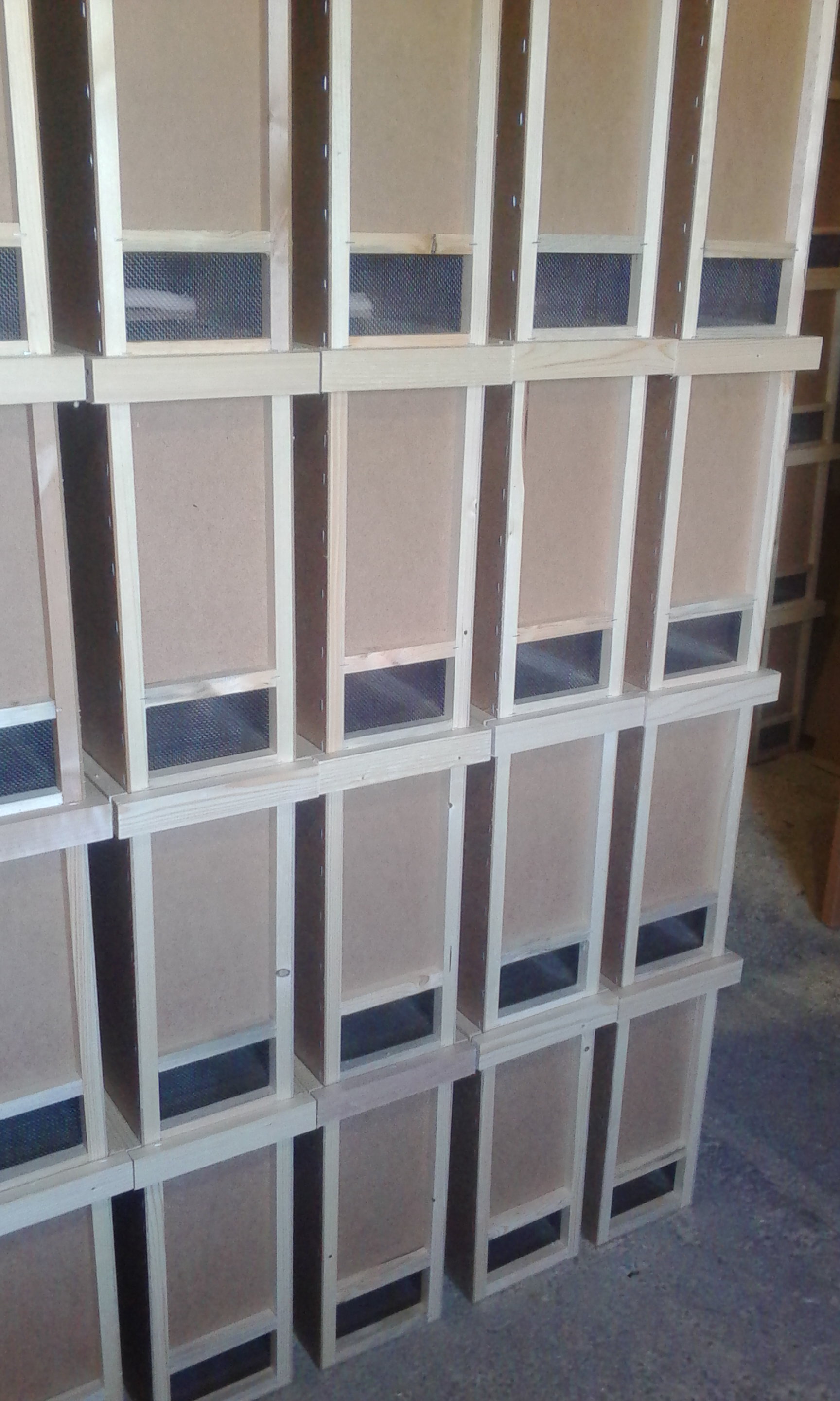 Прелагаю ящики для пчелопакетов на 4 рамки, либо на нужное кол-во по дополнительной договорённости. В нём имеются разделители для фиксации рамок, на передней и задней стенке, а также фиксатор из ППУ на дне. Крышка двигается в пазах, и может быть зафиксирована в закрытом положении скобой степлера или небольшим гвоздём. Контрукция пчелопакета позволяет ставить их один на один, до 4-х штук. При этом вышестояший вставляется внутрь верхней обвязки нижнего ящика, что дополнительно защищает их от перемещения относительно друг друга. Верхняяя обвязка также предохраняет пчёл от запаривания при длительной транспортировке, так как не позволяет пчелопакетам соприкасаться друг другом вплотную, и воруг них всегда есть воздушное пространство. Зарешёченные вентиляционные окошки имеются на передней и задней стенке. Торцевые бруски верхней обвязки также выполняют роль ручек, держась за которые очень удобно переносить пчелопакет.