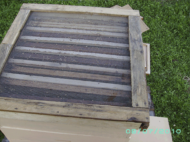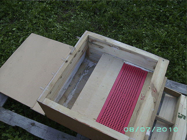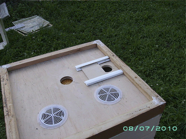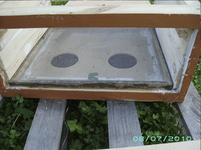 Дно высокое – 200 мм. Наружные размеры 520*520 мм. Нижняя часть, зарешечена сеткой, ячейки которой 2-3 мм. Спереди, съемный летковый заградитель, размером 100* 450 мм. В закрытом положении пчелы ходят через малые летки внизу. Во время главного взятка и активного лета пчел, я извлекаю этот вкладыш, и пчелы ходят через большое отверстие. Во-первых, это устраняет «очередь» прохода пчел, во- вторых, хорошея вентиляция при большом поступлении нектара в улей.