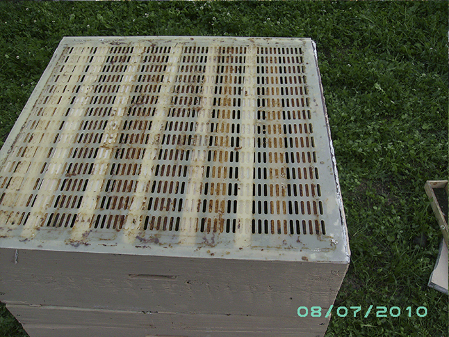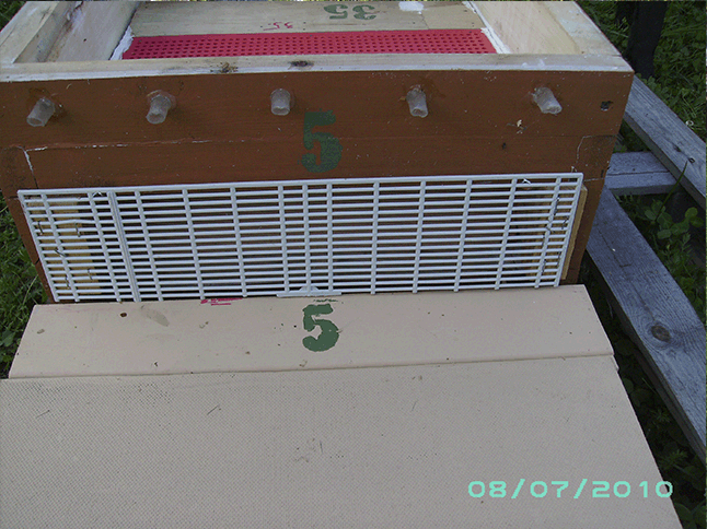 При извлеченном летковом заградителе, это пространство могу закрыть сеткой. Это делается для того, чтобы прекратить вылет пчел во время химической обработки посевов, лежащих рядом с пасекой (например, рапса). Спустя некоторое время, после обработки, извлекается сетка и опять ставится летковый заградитель.