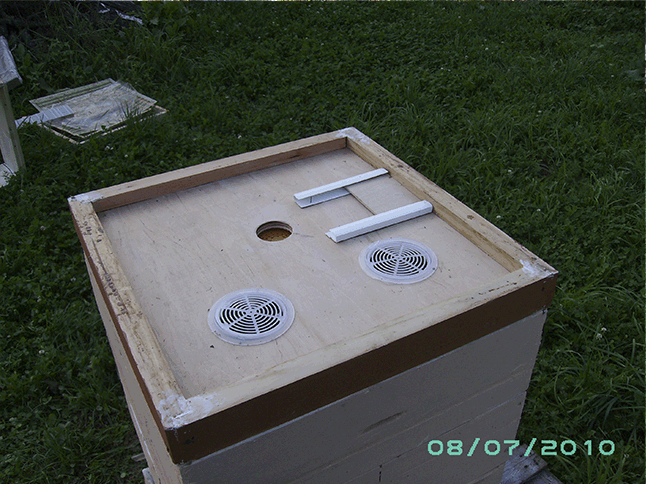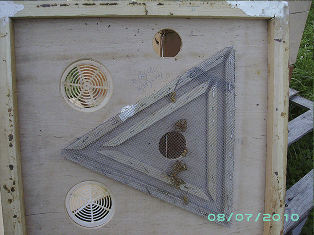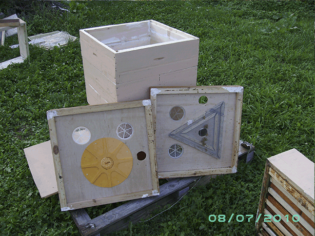 Так как он квадратный, то его можно поставить, как на холодный, так и на теплый занос. Рамка – на 145 мм. Ширина верхнего бруска 25 мм, боковых - 35мм, а нижнего – 6 мм. Нижний брусок вставляется в боковые вертикально. При таком положении, пчелы застраивают его до конца, и это способствует лучшему переходу из корпуса в корпус во время зимовки. Но если я хочу поставить в гнездо рамки на 300 мм, то ставлю два корпуса и получится 300 мм. В мой корпус вмещается 12 рамок, но в медовую часть гнезда я ставлю рамок меньше – 9 – 10. Между гнездовой частью и медной ставлю разделительную (ганимановскую) решетку в рамке, чтобы было больше пространства для прохода пчел. Для удаления пчел с медовых корпусов перед откачкой меда я использую пчелоудалители. У меня их два вида: самодельный – типа Квебека и покупной – диаметром 26см на 8 выходов пчел. Они больших размеров и пчелы быстро освобождают медовые корпуса. Если надо освободить от пчел 1-2 медовых корпуса, то достаточно ночи, а если 3-4 , то возможно понадобиться и сутки. Так как я всегда стараюсь использовать рабочую поверхность в полном объеме, то пчелоудалитель в этой рамке используется в комплекте с другими приспособлениями. Это два отверстия диаметром 100 мм со специальной сеткой, которые служат для кормления пчел сахарным сиропом или другими жидкостями. Так же через эти отверстия, сняв сетку, могу поставить в гнездо полоски для лечения пчел от варроатоза, а после окончания лечения – достать их. Через эти отверстия весной могу положить на рамки канди, не раскрывая гнезда. В этом же приспособлении есть еще одно отверстие диаметром 50 мм, которое закрывается подвижной заслонкой. Оно нужно для запуска пчел при осушке рамок после откачки. Об этом более подробно. И так после освобождения медовых корпусов от пчел, снимаю их. Гнездо остается закрытым этим приспособлением и крышкой. Откачиваю мед и составляю пустые рамки в эти же корпуса. Теперь их надо осушить. Ставлю корпуса с рамками после центрифугирования меда и специальным приспособлением открываем отверстие диаметром 50 мм. Теперь пчелам открыт вход к этим рамкам, и они делают свое дело. И так от забора рамок на откачку и до осушки их, с пчелами практически нет открытого контакта Мне хорошо, пчелам хорошо, а особенно - соседям.