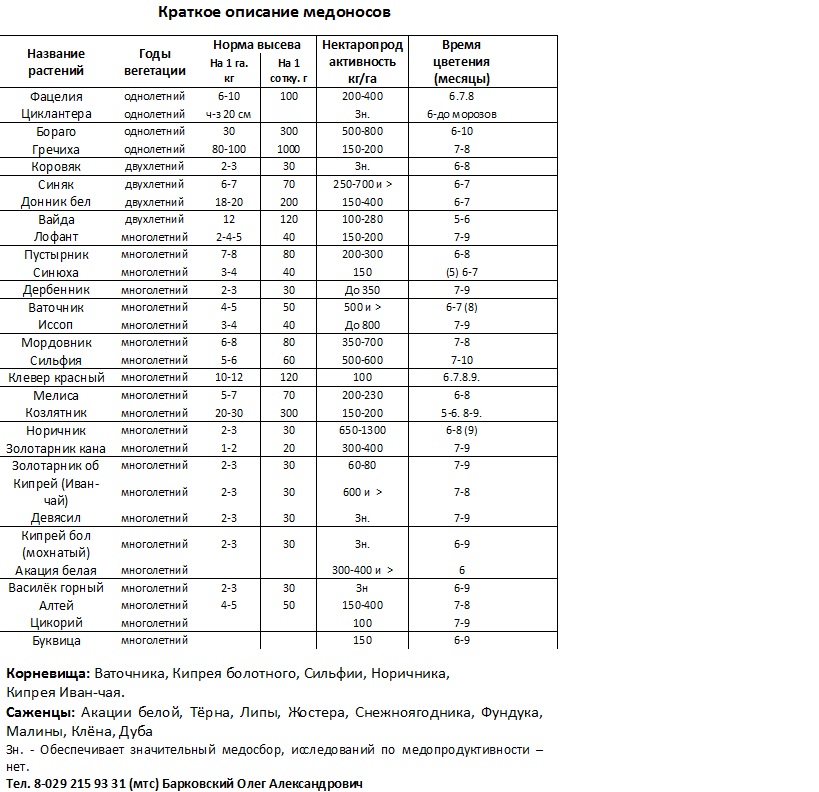 Циклантера, Бораго, Гречиха, Коровяк, Синяк, Донник бел, Вайда, Лофант, Пустырник, Синюха, Дербенник, Ваточник Иссоп, Мордовник, Сильфия, Клевер красный, Мелиса, Козлятник, Норичник, Золотарник канадский,